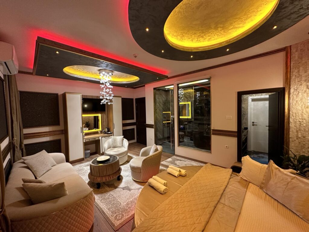 Сите соби се совршено удобни и пространи со прекрасно декорирани ѕидови, модерен дизајн, вдлабнато осветлување, огледала и хром кои се комбинираат за да го дополнат елегантното но и чувството на современост. Удобноста е присутна особено на леглата, ви гарантираме дека ќе се разбудите наспани и среќни. А за тоа дополнително ќе допринесе и постелнината со висок број на конци и перници кои ветуваат возбудливи соништа.